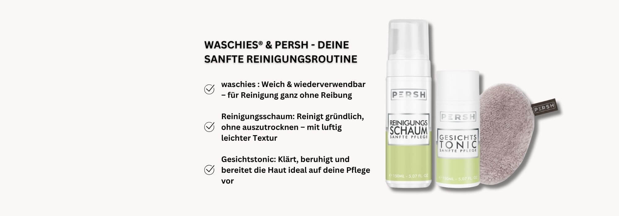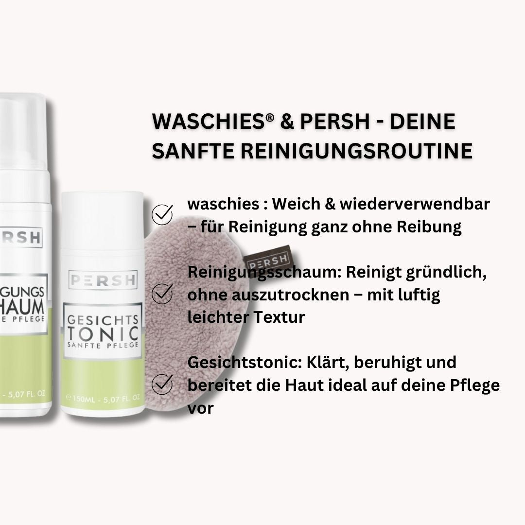 Die PERSH × waschies® Pads sind langlebig, hautfreundlich und ersetzen hunderte Einweg-Wattepads - für eine saubere Haut und ein gutes Gefühl.