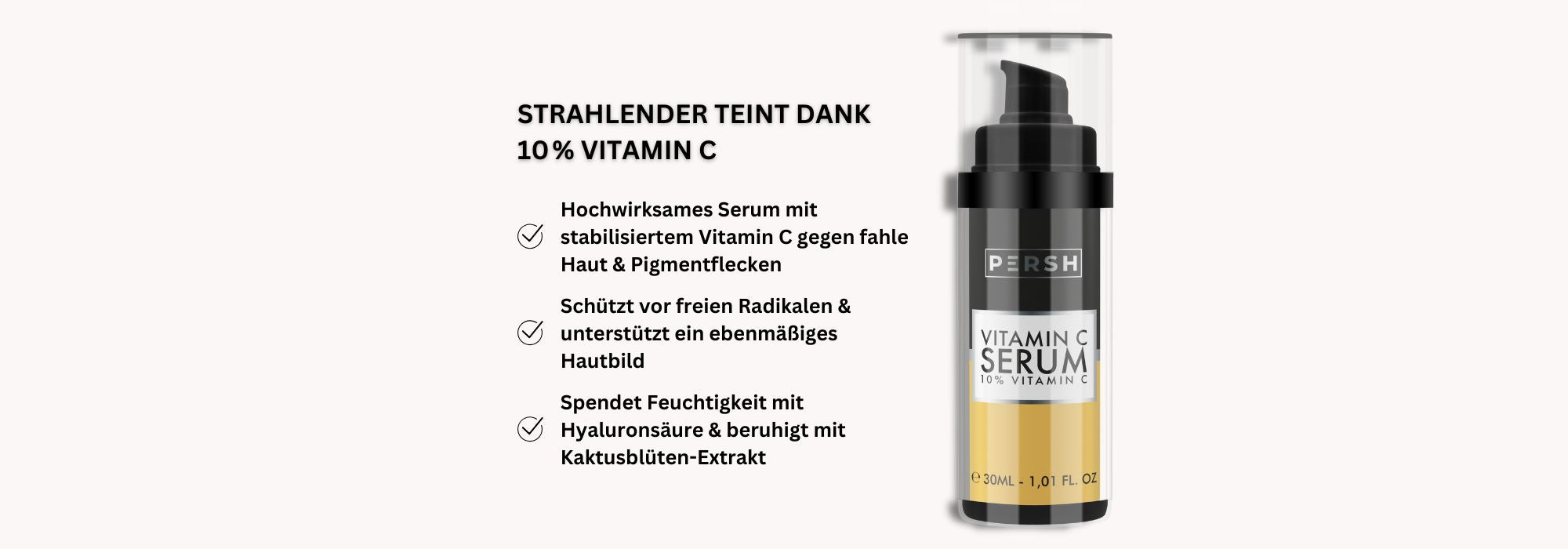 Unser Vitamin C Serum mit 10 % stabilisiertem Vitamin C schützt die Haut vor freien Radikalen, unterstützt ein ebenmäßiges Hautbild und mildert Pigmentflecken sichtbar.